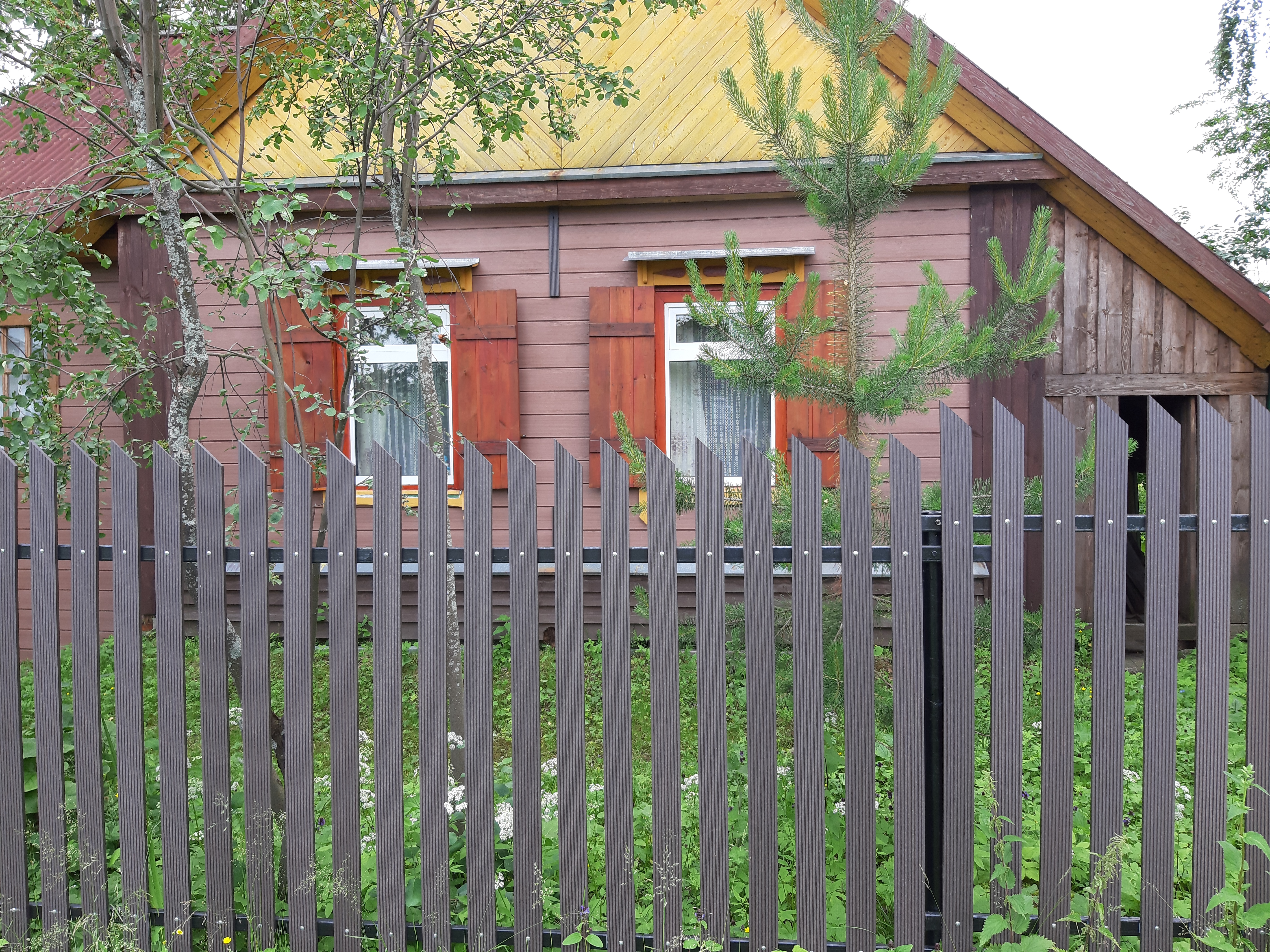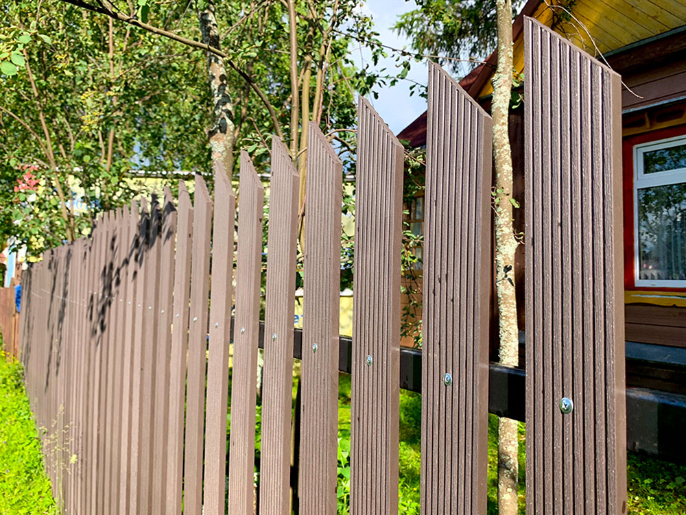 Для реализации этого проекта, нам понадобился специальный узкий полнотелый штакетник из ДПК. Ведь у владельца не так много времени посещать дачу и постоянно поддерживать деревянный штакетник в идеальной форме. Для ДПК-же такой уход не требуется и достаточно просто использовать по мере необходимости специальное средство для очистки ДПК и средство для защиты декинга. И он прослужит вам долгие годы не потребовав ничего дополнительно.
